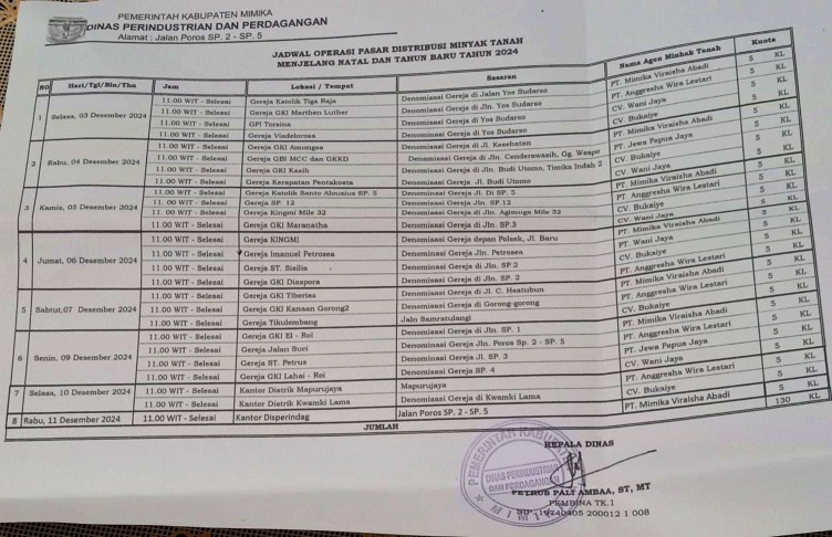 Papua60detik – Menyambut Hari Raya Natal 25 Desember 2024 dan Tahun Baru 1 Januari 2025, Dinas Perindustrian dan Perdagangan (Disperindag) Mimika mengadakan operasi pasar murah minyak tanah bersubsidi.