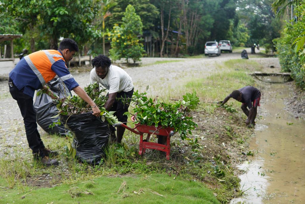 Papua60Detik - PT Petrosea site Timika menggelar kegiatan kerja bakti bersama dalam rangka Pemberantasan sarang nyamuk (PSN) di Kampung Mandiri Jaya, Distrik Wania, Kabupaten Mimika, Papua Tengah, Sabtu (22/5/2023).
