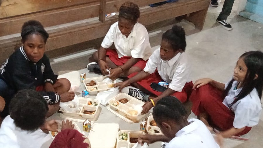 Usai meninjau dapur umum Timika, Rahayu Saraswati dan tim melaksanakan simulasi makan bergizi gratis di SD Advent Kuala Kencana. Sekitar 60 siswa kebagian paket makanan.