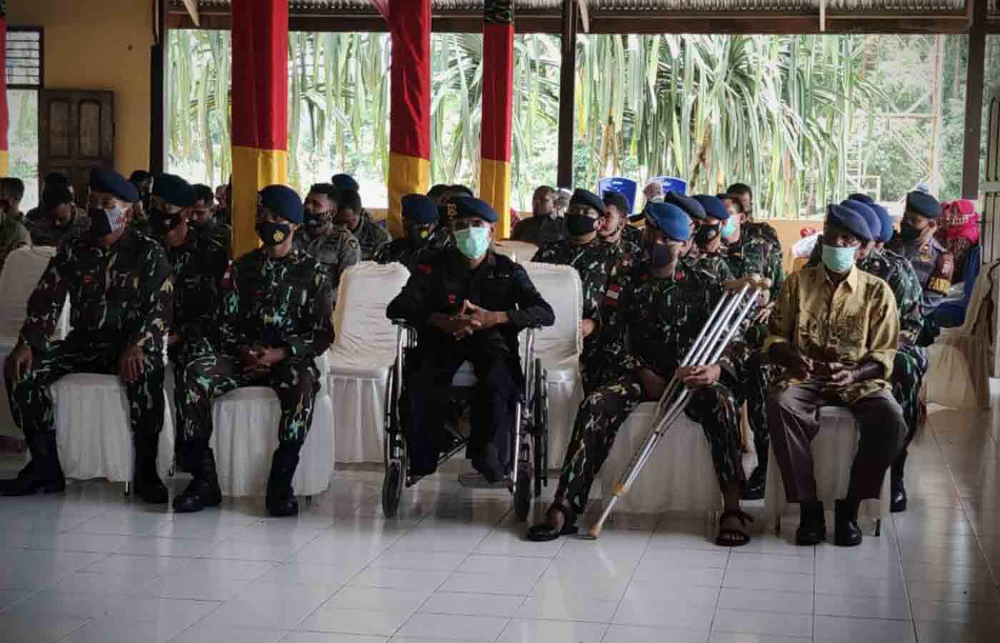Papua60detik - Brimob Batalyon B Pelopor Polda Papua mengadakan acara syukuran memperingati HUT Korps Brimob Polri ke-75 di Mako Brimob Gedung Ronald H Sopamena, Jalan Agimuga Mile 32, Sabtu (14/11/2020). Mengingat Pandemi Covid-19, syukuran tersebut dilakukan sangat sederhana tapi khidmat. Syukuran hanya dihadiri Forkopimda dan para pasukan Brimob. Sebelumnya berbagai kegiatan telah dilakukan mulai dari pemberian bantuan sosial kepada masyarakat di Kampung Mandiri Jaya, Distrik Wania, tabur bunga, upacara penyucian tunggul dirangkai doa lintas agama hingga upacara virtual. (Salmawati Bakri)