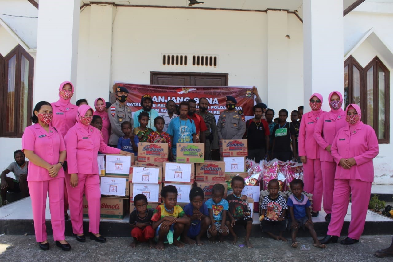 Danyon B Pelopor Satbrimobda Papua Kompol Ramadhona menyerahkan bantuan tali asih kepada masyarakat melalui tokoh agama.
