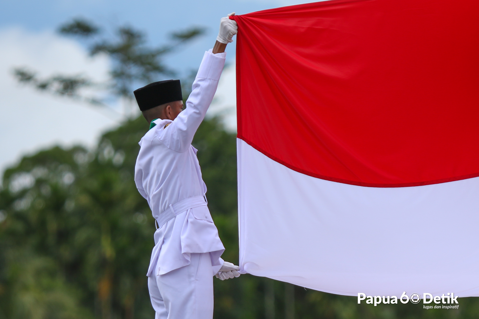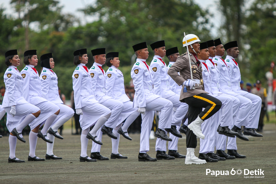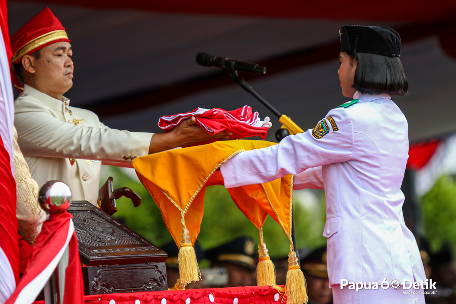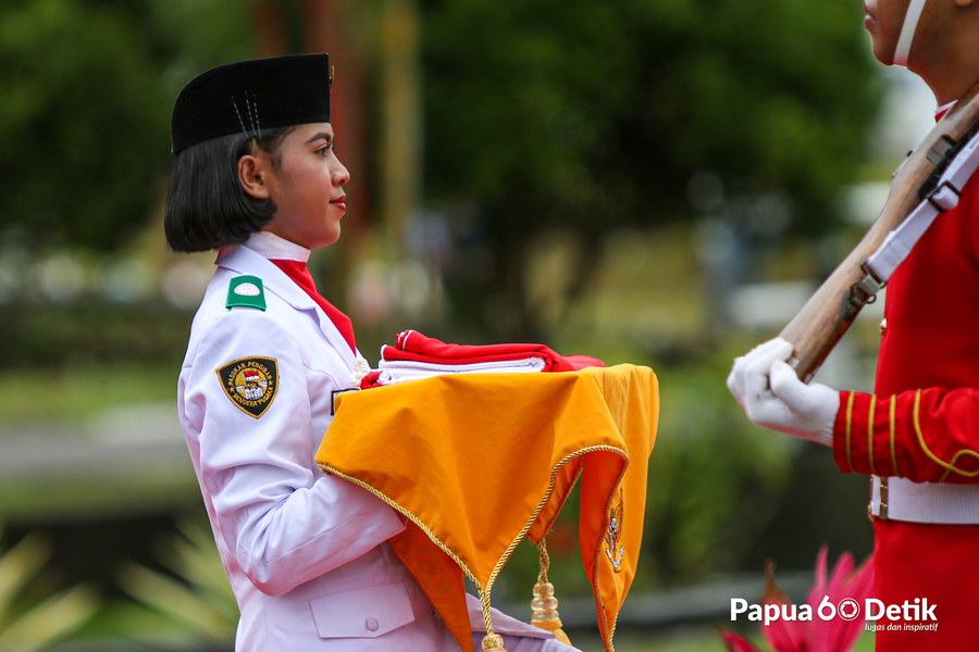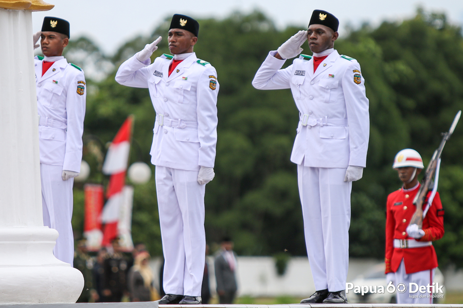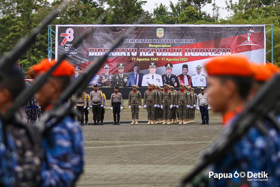 Pengibaran Bendera Merah Putih memperingati HUT Kemerdekaan RI ke 78 di Lapangan Pusat Pemerintah Kabupaten Mimika, Provinsi Papua Tengah, Kamis (17/8/2023). Foto: Papua60Detik / @joejosephsitumorang