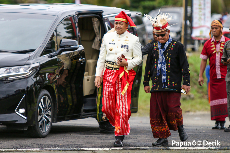 Bertindak selaku pemimpin upacara, Pj Bupati Mimika Valentinus Sudarjanto Sumito mengenakan baju adat Makassar.