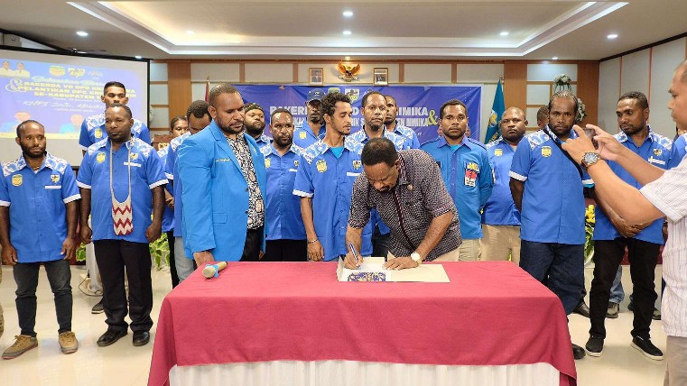 Penandatanganan Berita acara pelantikan Pengurus DPC KNPI se-Distrik Mimika