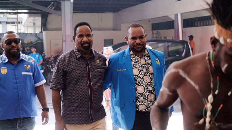 Ketua DPD KNPI Mimika Awen Magai menyambut kedatangan Asisten II Setda Mimika Willem Naa.