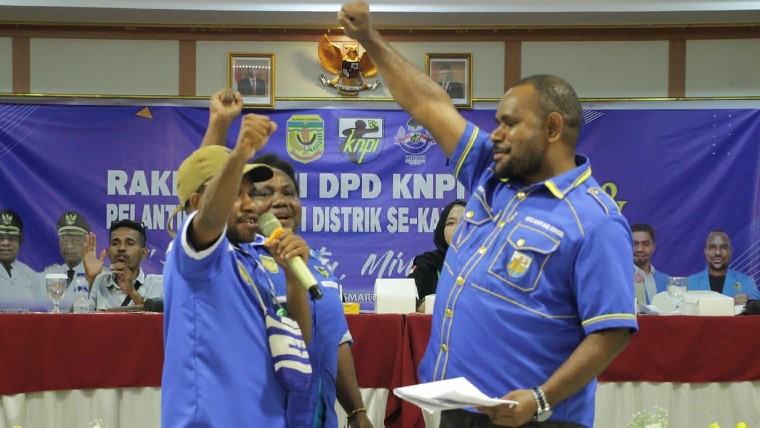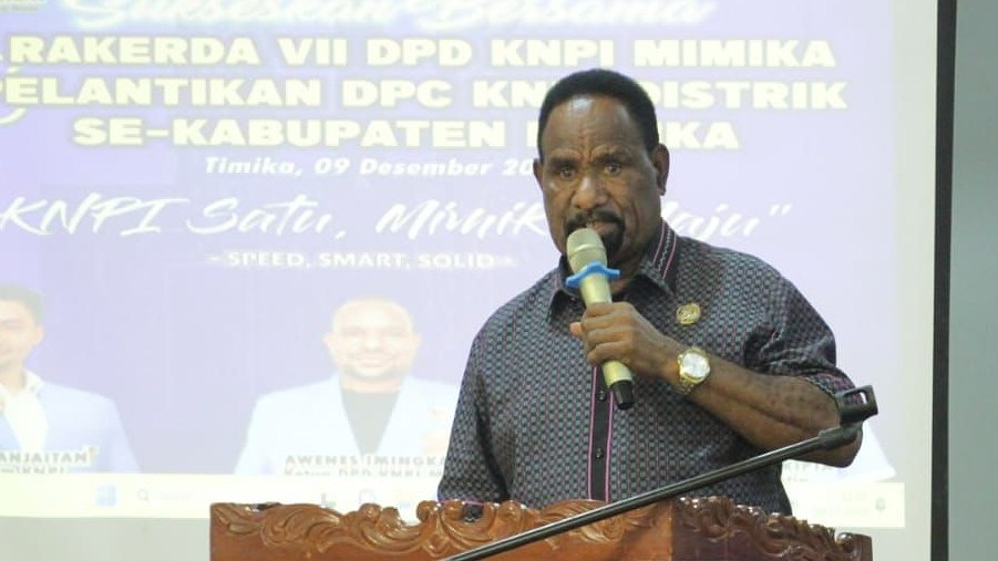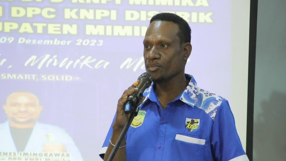 Papua60detik - Ketua DPD Komite Nasional Pemuda Indonesia (KNPI) Mimika, Awenes Imingkawak melantik 18 DPC Distrik se-Kabupaten Mimika periode 2023-2026 di Hotel Cenderawasih 66, Timika, Papua Tengah, Sabtu (9/12/2023). (Faris)