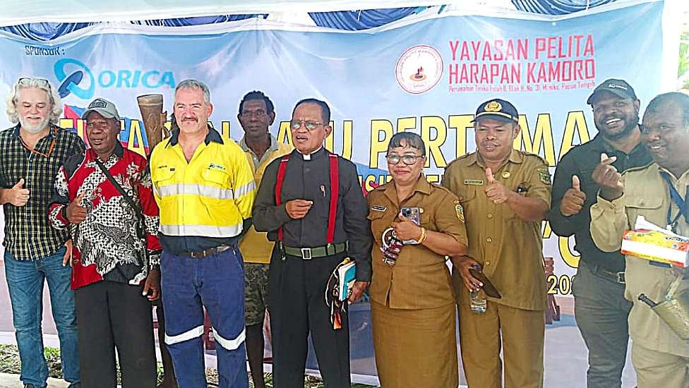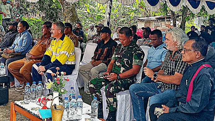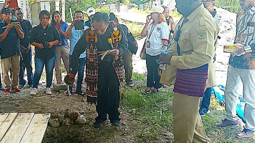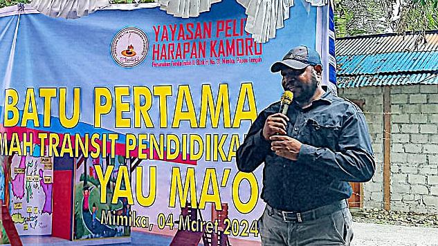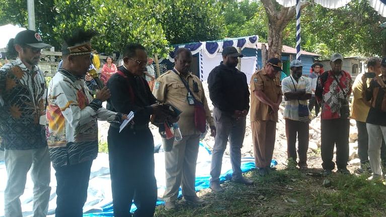 Papua60detik - Upacara pemberkatan dan peletakan batu pertama pembangunan Rumah Transit Pendidikan Yau Ma'o berlangsung di kawasan Gorong-Gorong, Timika, Senin (4/3/2024). Penggagasnya, Leonardus Tumuka, mengatakan rumah transit ini mengutamakan anak-anak Suku Kamoro. (Martha)