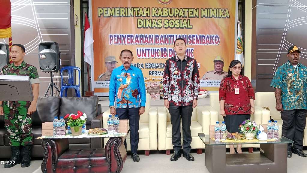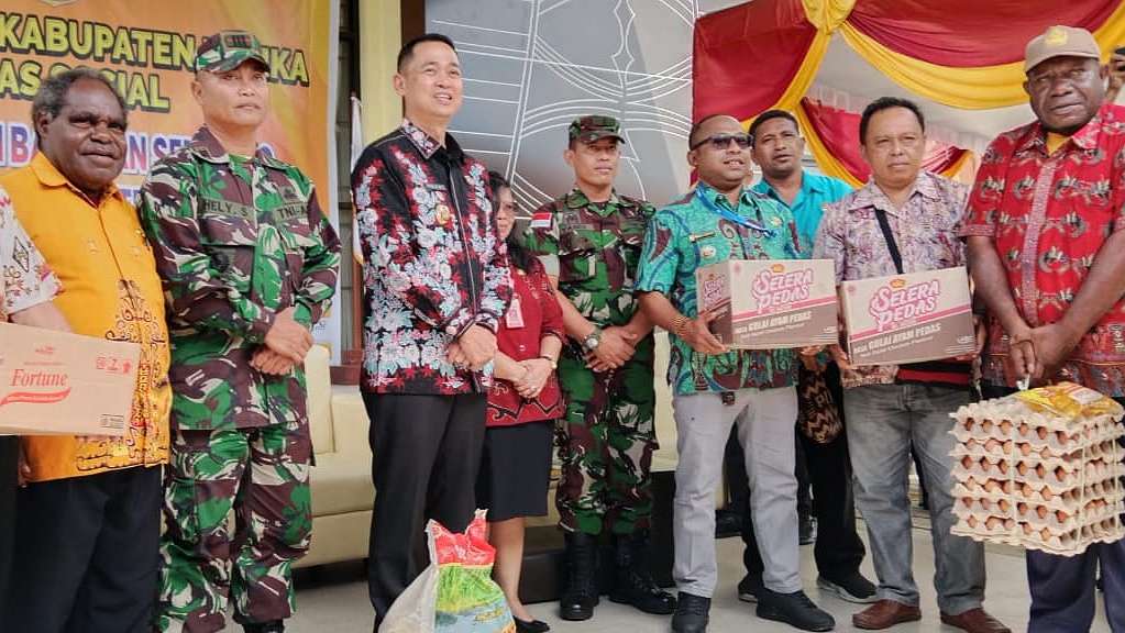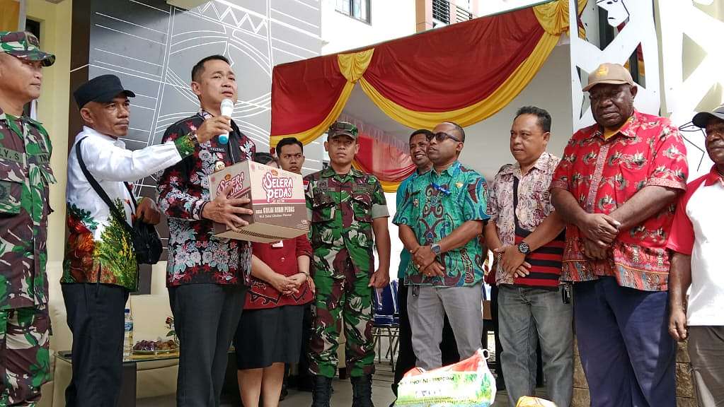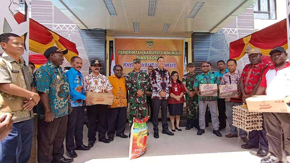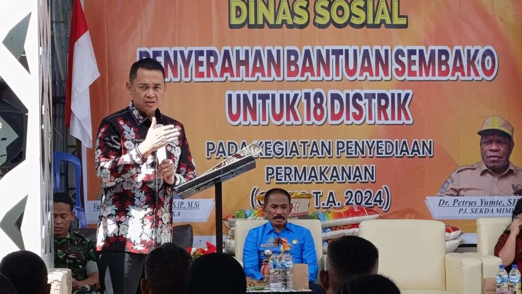 Pj Bupati Mimika, Valentinus S Sumito menyerahkan bantuan penyediaan permakanan secara simbolis kepada salah satu kepala distrik