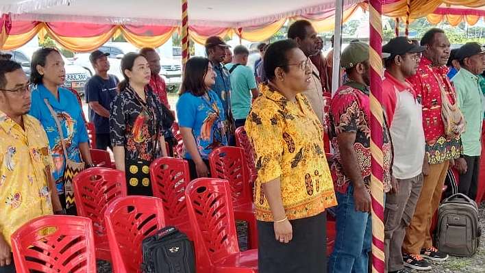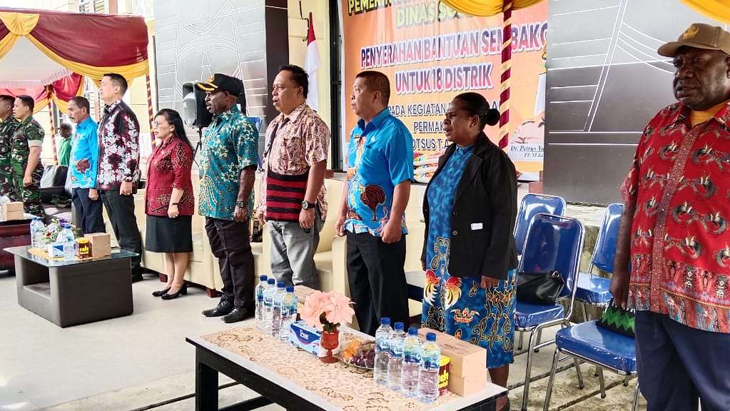 Para kepala distrik saat menerima bantuan penyediaan permakanan secara simbolis dari Pj Bupati Mimika, Valentinus S Sumito