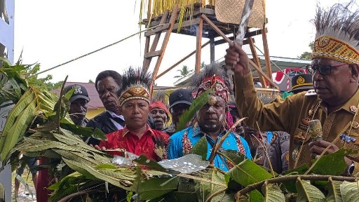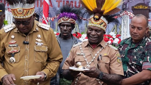 Kadistrik Mimika Timur, Oktovianus Kum menerima potongan tumpeng dari Plt Bupati Mimika, John Rettob.