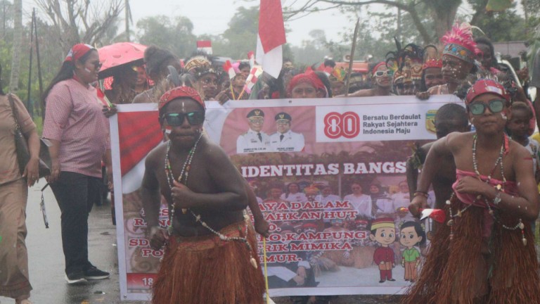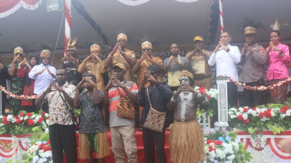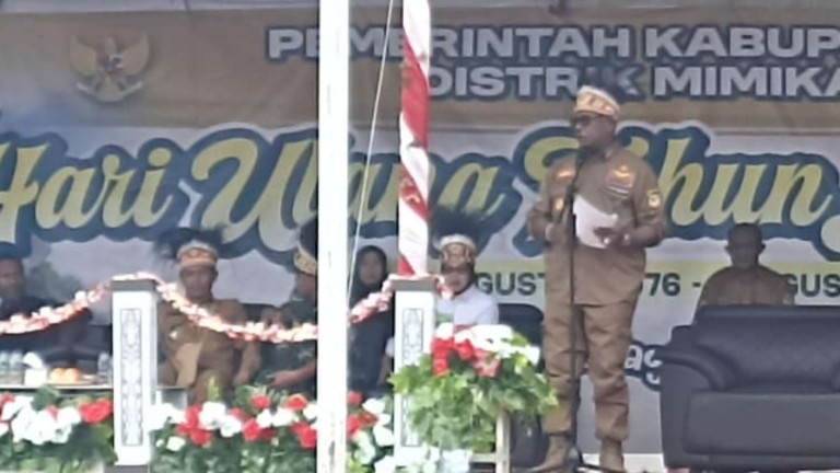 Papua60detik - Hari Ulang Tahun (HUT) ke 49 Mapurujaya Distrik Mimika Timur berlangsung meriah di halaman kantor distrik, Selasa (19/8/2025). Puncak perayaannya dihadiri oleh Bupati Mimika Johannes Rettob, Wakil Bupati Mimika Emanuel Kemong, Pj Sekda Mimika Abraham Kateyau, Ketua DPRK Mimika Primus Natikaperiyau, Wakil Ketua DPRK Mimika Asri Akkas dan anggota DPRK Mimika Rampeani Rachman. (Eka)