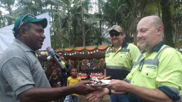 Direktur PT Putra Otomona Jaya, Gregorius Okoare membagikan kue HUT ke perwakilan PT Petrosea.