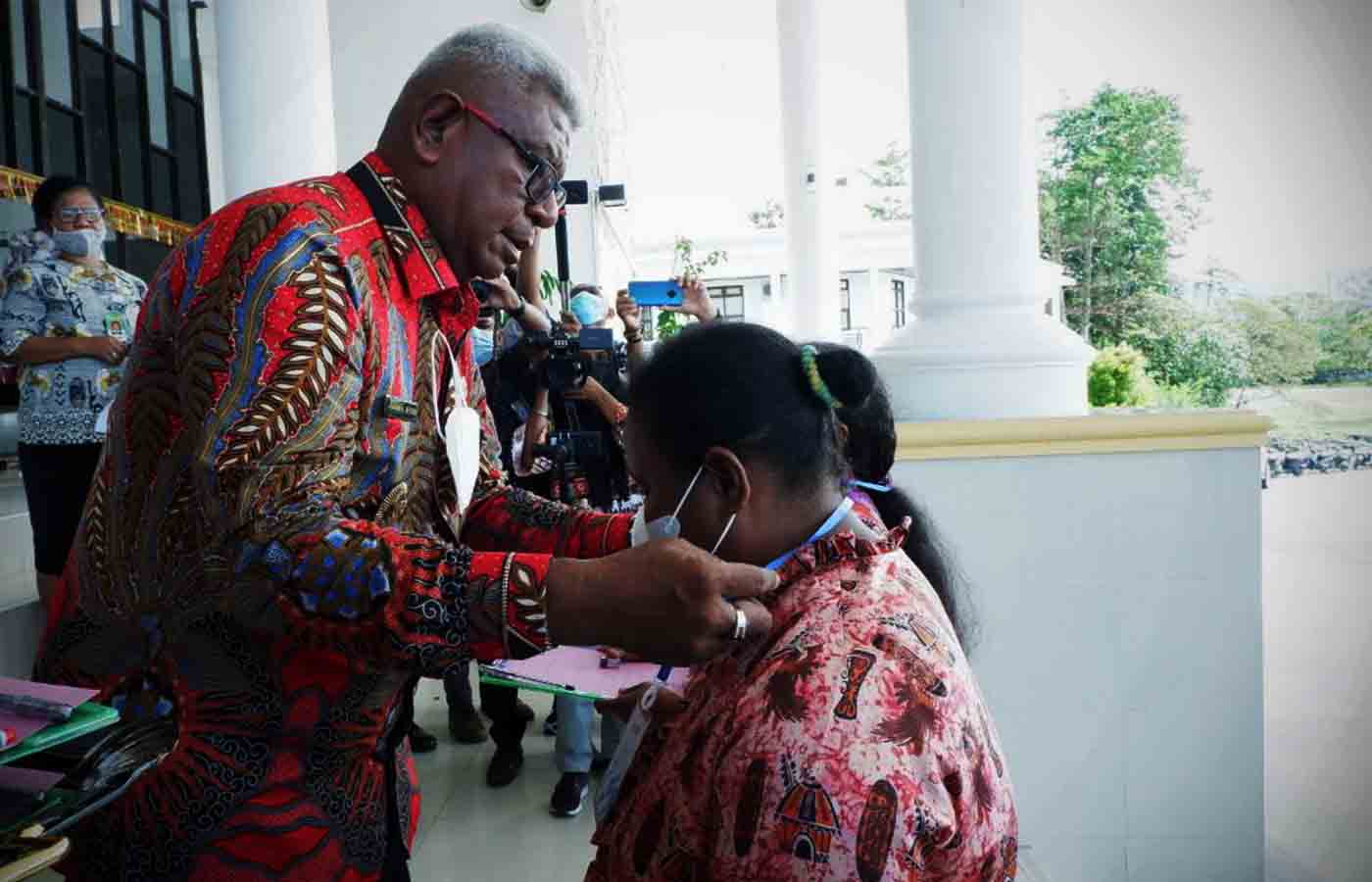 Wakil Bupati Mimika mengalungkan name tag ke petugas pendataan.