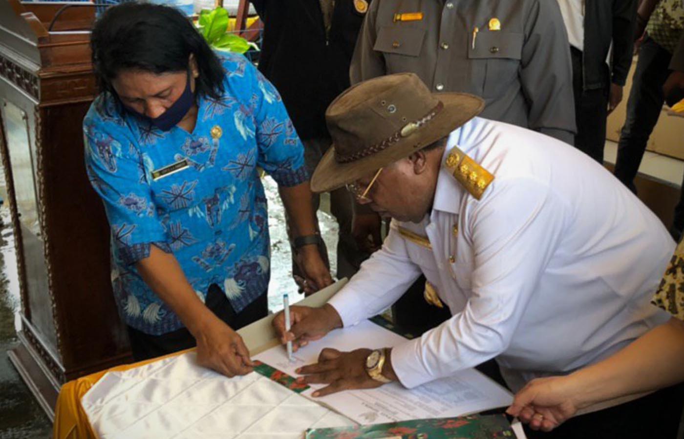 Didampingi Kadis Perikanan Mimika, Leentje Siwabessy, Bupati Mimika, Eltinus Omaleng menandatangani berita acara penyerahan bantuan paket alat tangkpa perikanan kepada nelayan.
