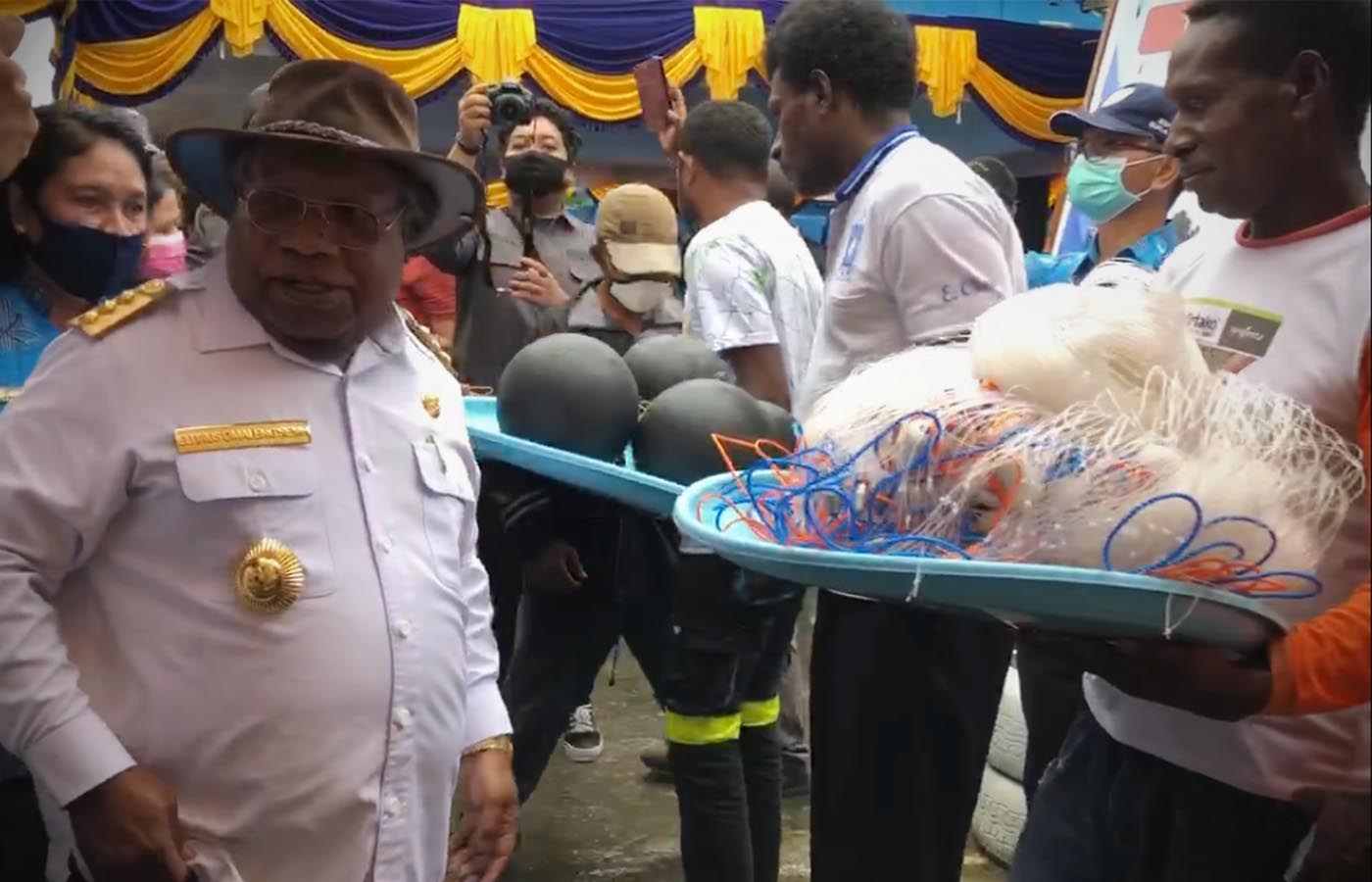 Papua60detik - Pemerintah Kabupaten Mimika melalui Dinas Perikanan membagikan paket alat tangkap perikanan kepada kelompok nelayan Orang Asli Papua (OAP). Anggaran bantuan tersebut bersumber dari dana Otsus. Bantuan diserahkan oleh Bupati Mimika, Eltinus Omaleng di Kawasan Industri Perikanan Terpadu Pomako, Rabu (29/07/2020). (Yunita S)