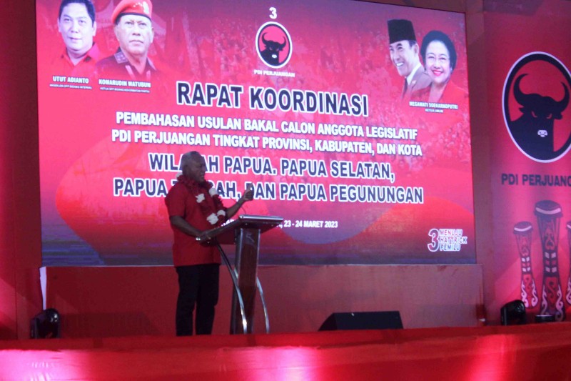 Papua60detik - Ketua Bidang Kehormatan DPP PDIP, Komarudin Watubun membuka rapat koordinasi (Rakor) DPD PDIP Wilayah Papua, Papua Tengah, Papua Selatan dan Papua Pegunungan di Graha Eme Neme Yauware, Timika, Kamis (23/3/2023). Rakor tersebut dilaksanakan dalam rangka pemantapan konsolidasi kepartaian menuju Pemilu 2024. (Faris)
