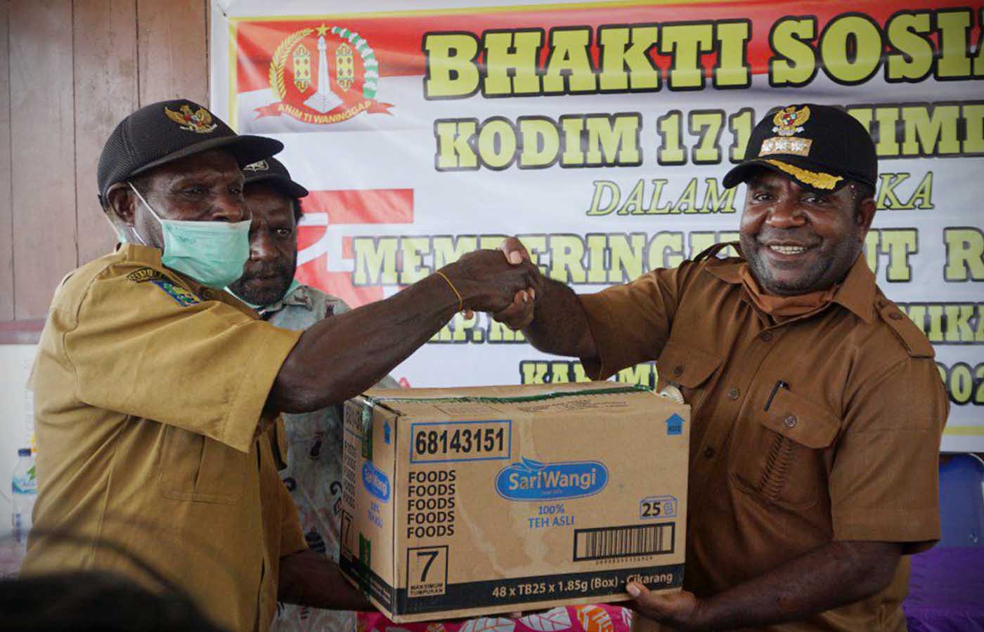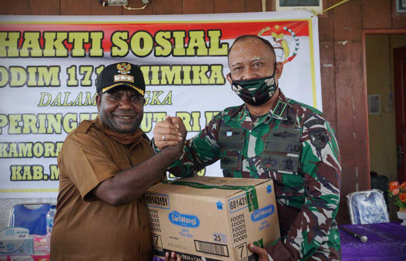 Dandim 1710/Mimika Letkol Inf Pio L Nainggolan secara simbolis menyerahkan bantuan.