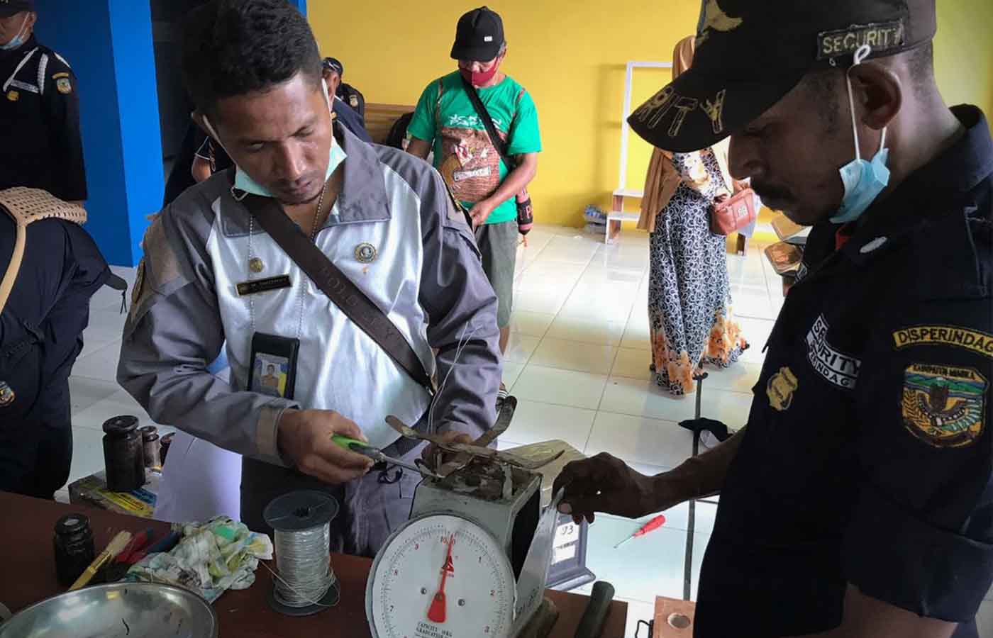Petugas Disperindag Mimika sidang tera dan tera ulang di Pasar Sentral Timika.