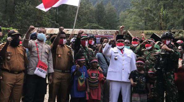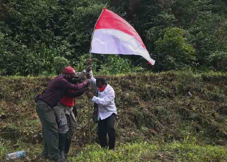 Warga Banti mengibarkan bendera merah putih.